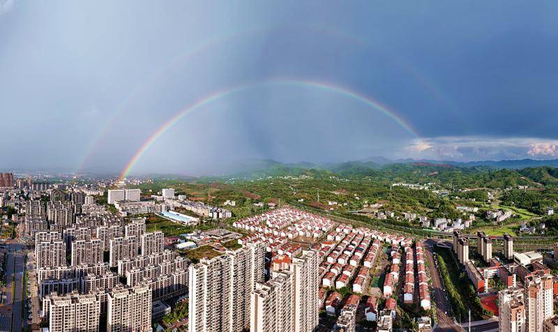 一场大雨后,会昌县城上空出现一道绚丽双彩虹。吕春华摄
