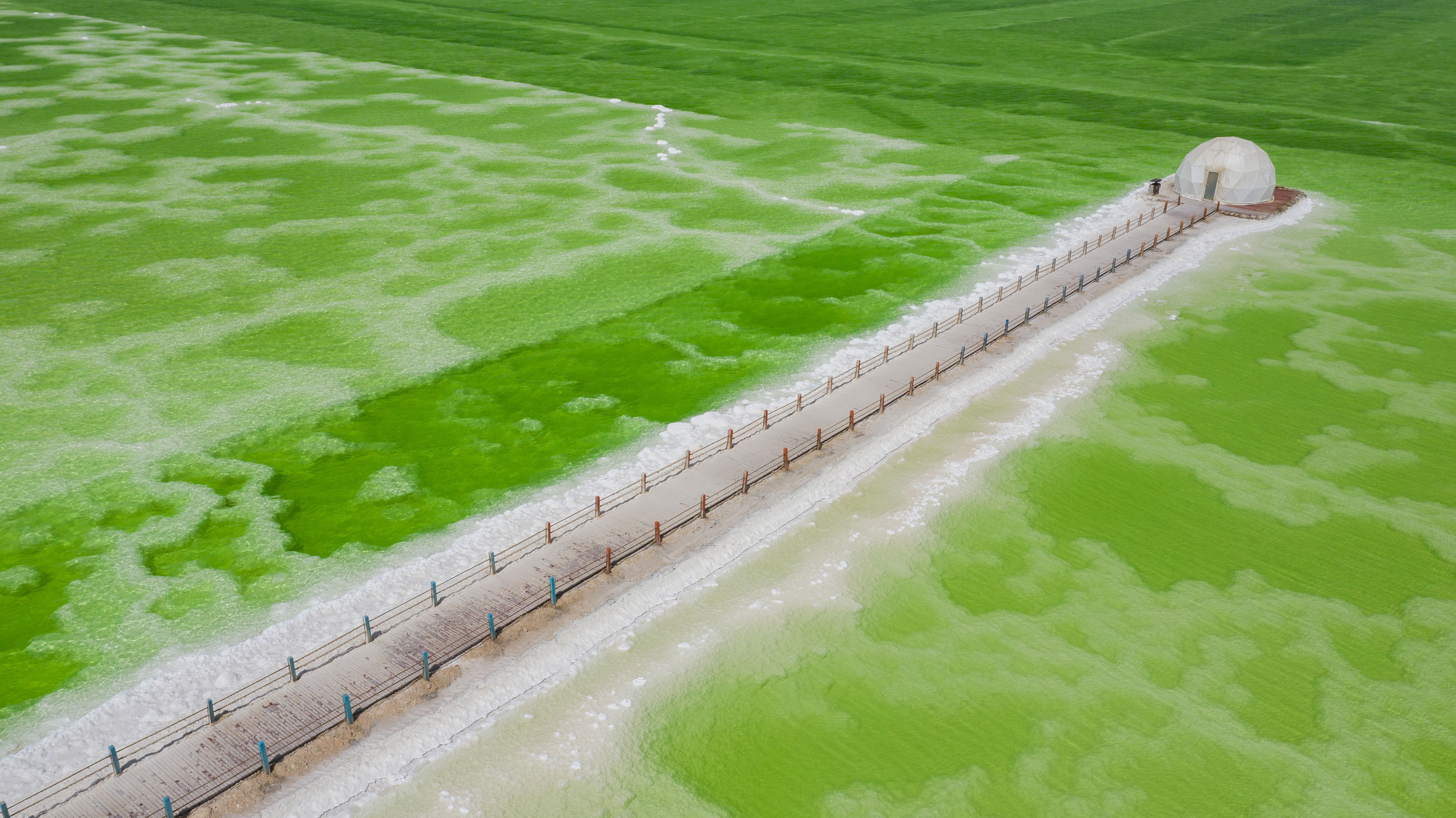 察尔汗盐湖,是中国最大的盐湖之一,宛如遗落在地球上的翡翠明珠,荧光绿的岩湖在阳光下晶莹剔透,闪烁着迷人的光芒,湖面上形成一片白色的盐晶,非常壮观,如此惊艳绝美的盐湖风光一定不要错过!