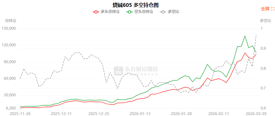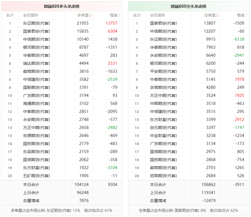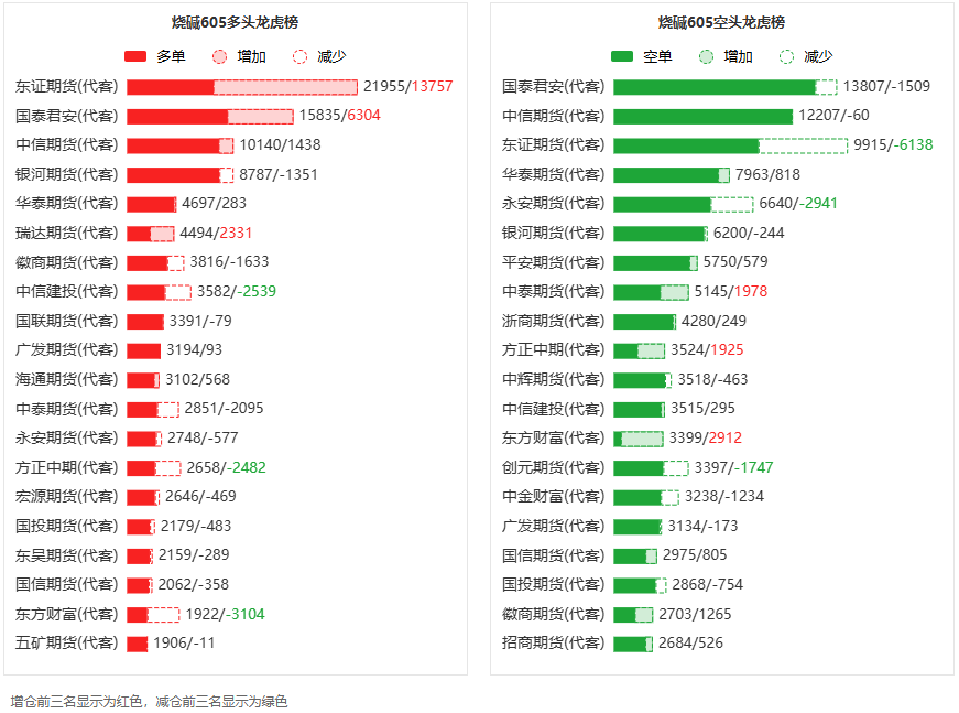 总体而言,烧碱605合约今日减仓上行,多空持仓排名前20席中,多方呈进场态势,空方呈退场态势。