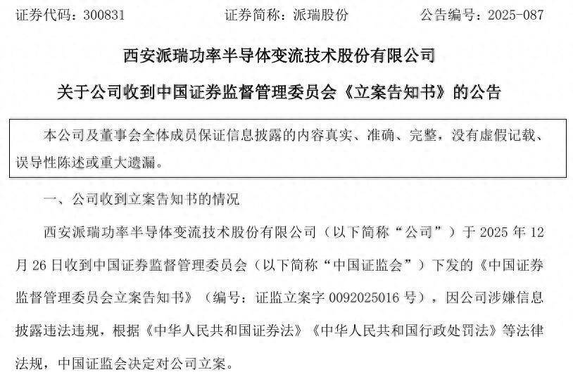 12月26日晚间,派瑞股份公告称,公司于2025年12月26日收到中国证监会下发的《立案告知书》,因公司涉嫌信息披露违法违规,中国证监会决定对公司立案。