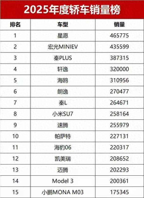 放眼2025年的中国轿车市场,是一场新旧力量激烈碰撞的格局。根据行业权威数据,从年度销量前十的轿车车型名单来看,以比亚迪、吉利为代表的中国品牌,凭借新能源技术的全面领先,以前所未有的密集阵型占领高地,而以日产、大众等传统合资巨头组成的阵营依靠深厚的品牌积淀和产品韧性,在变局中固守了核心市场,接下来我们就来看看前十名车型的销量表现。