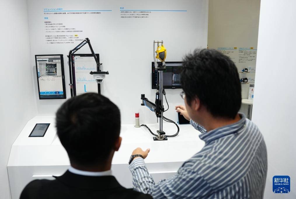 r10月14日,在日本千叶县,人们在2025年日本高新技术博览会一处展示柜台前交谈。