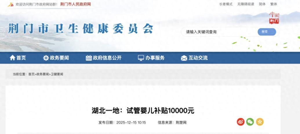 (人民日报健康客户端记者 侯佳欣)近日,湖北省荆门市发布《关于完善生育支持政策体系的若干措施》,系统性降低家庭在生育、养育、教育方面的成本。该政策将于2026年1月1日起正式施行。值得注意的是,措施中明确了对需要辅助生殖技术的家庭给予补贴,人工授精最高补助3000元,试管婴儿最高补助10000元。