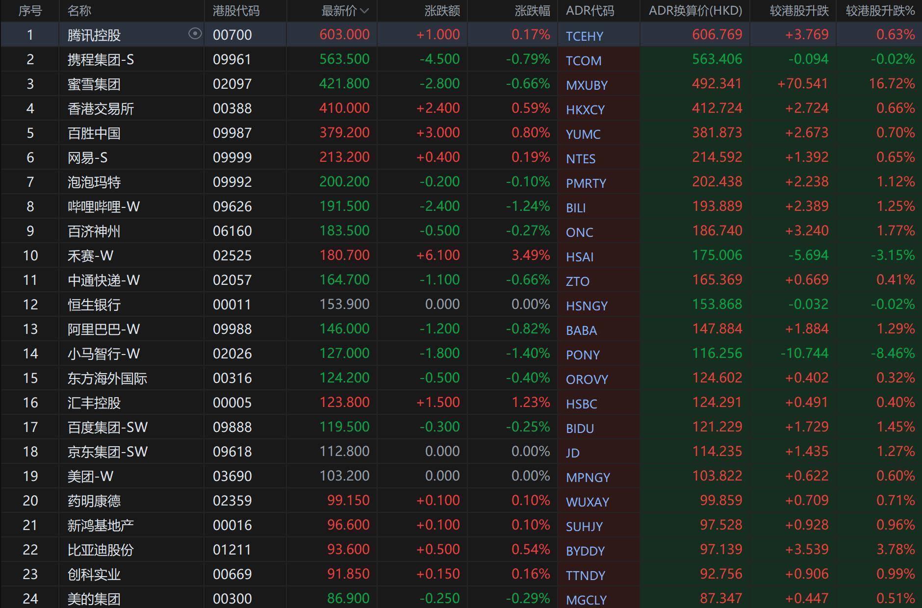 大型蓝筹股涨跌不一,汇丰控股收报124.291港元,较香港收市升0.40%;腾讯控股收报606.769港元,较香港收市升0.63%。