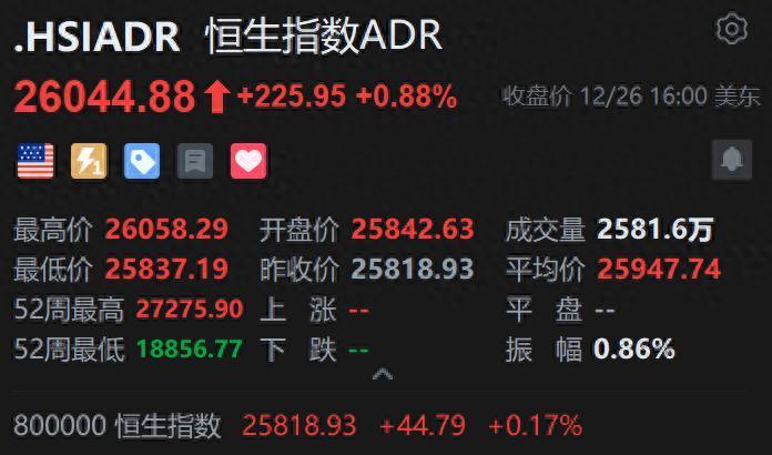 智通财经APP获悉,周五,美股三大指数收跌。恒生指数ADR上涨,按比例计算,收报26044.88点,较香港收市涨225.95或0.88%。
