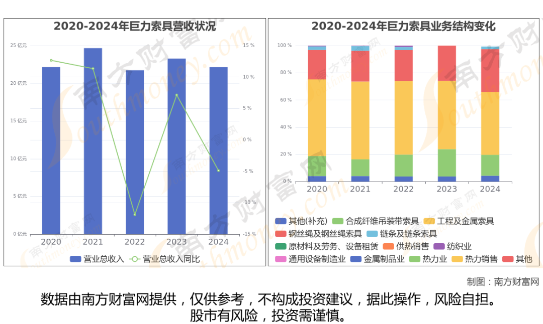 巨力索具年报数据显示(如上图),2024年实现营业总收入22.14亿,同比增长-4.88%,近5年复合年增长率-0.01%。