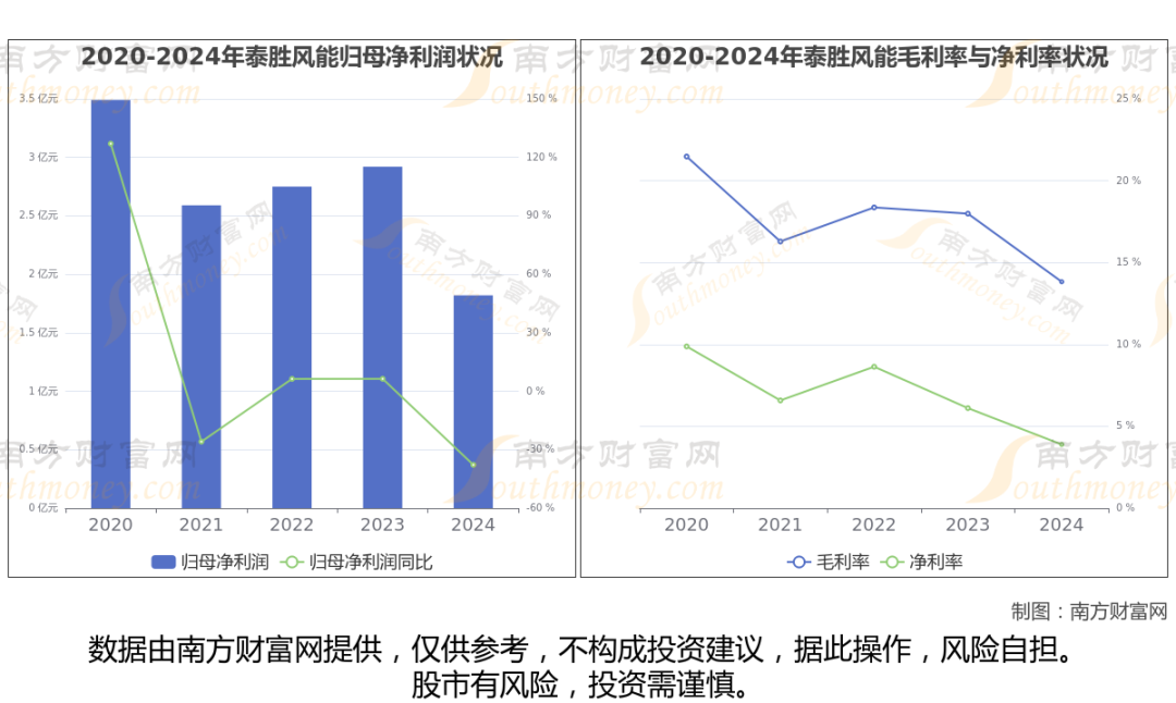 数据显示(如上图),泰胜风能2024年营业收入为48.38亿,同比增长0.52%,近5年复合年增长率7.64%。