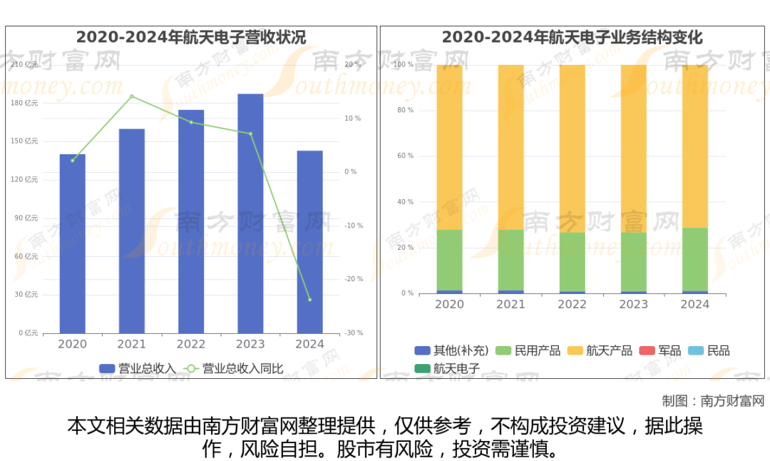 (如上图)2024年航天电子公司营业总收入142.8亿,同比增长-23.75%,近五年复合增长率为0.48%。