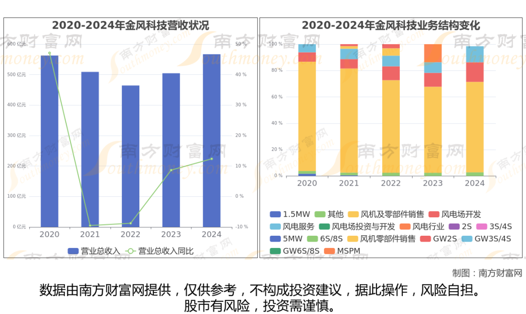 (如上图)2024年金风科技公司营业总收入为566.99亿,同比增长12.37%,近5年复合增长率为0.19%。