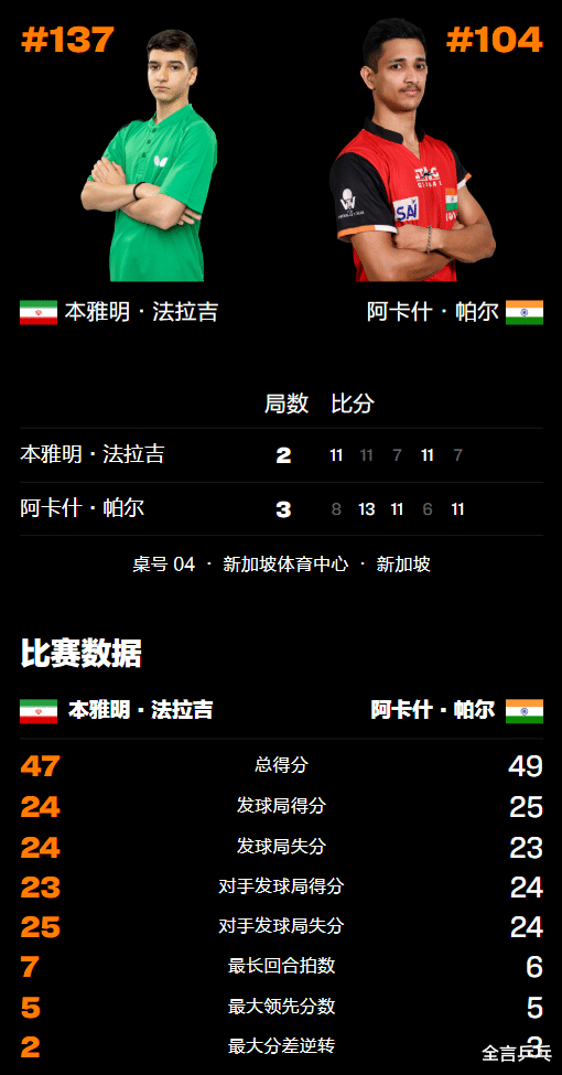 第二局成为了本场比赛的转折点,法拉吉多次领先后被反超,9-6连输4球出现局点,顽强追平后仍然以11-13落败,第三局状态一落千丈,上来就不断陷入被动,始终在追赶、从未超越对手,最终以6-11再负被逆转,帕尔由此而手握两局胜利在望。